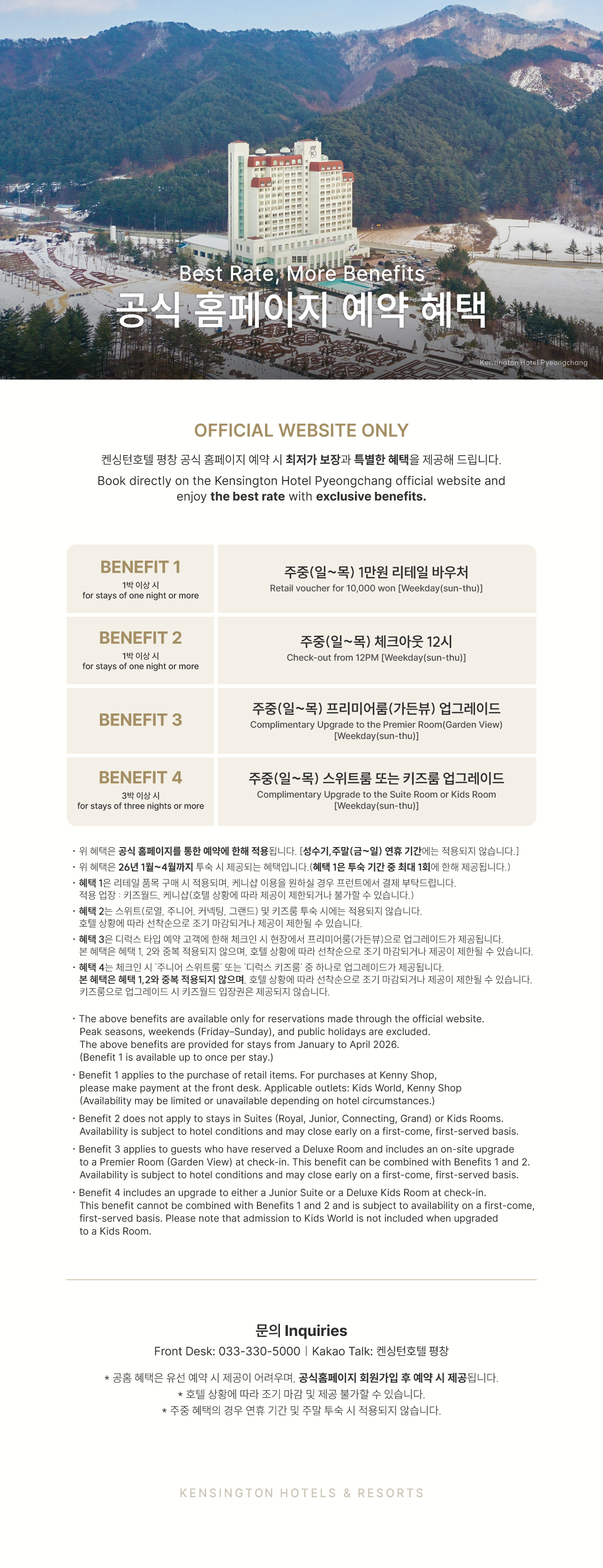 home 프로모션 객실 다이닝 웨딩&연회 부대시설 액티비티 호텔소개 OVERVIEW 패키지 다이닝 & 이벤트 지점소식 지점소식 공식 홈페이지 혜택 2025. 12. 09 켄싱턴호텔 평창 공식 홈페이지 예약 시 특별한 혜택을 제공해드립니다. 목록