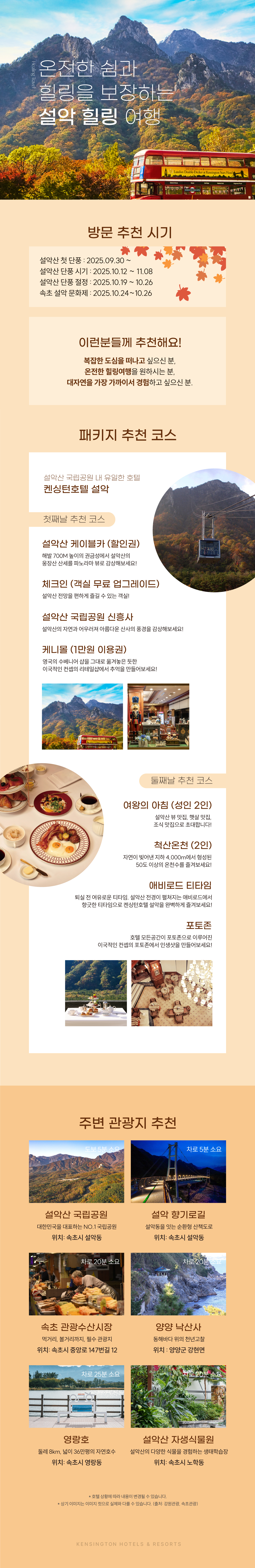 단풍이 붉게 물든 설악에서 온전히 즐길 수 있는 여행을 떠나보세요.