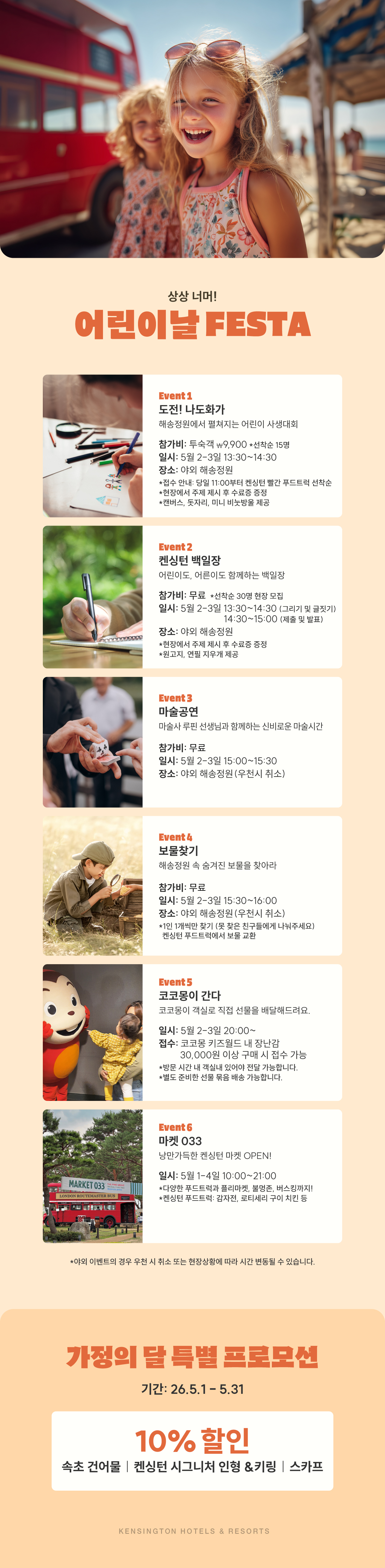 home 프로모션 객실 다이닝 웨딩&연회 부대시설 액티비티 리조트소개 OVERVIEW 패키지 다이닝 & 이벤트 지점소식 지점소식 2026 어린이날 FESTA 2026. 04. 24 2026 어린이날 FESTA 목록