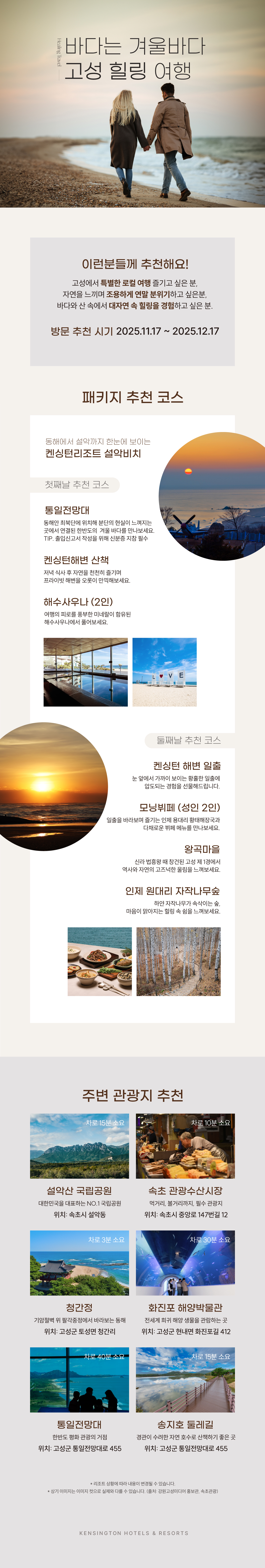 관심상품 공유하기객실 1박 + 모닝뷔페 2인+ 해수사우나 2인 + 부대업장 1만원 + 속초중앙시장 1시간 주차권
