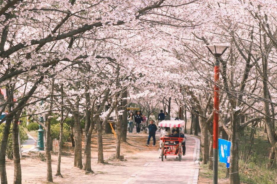 호수를 따라 만개한 벚꽃나무 아래 자전거를 타며 여행의 꽃을 피워보세요