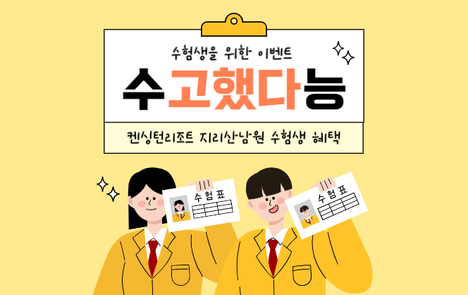 이벤트 수험생 혜택 수고했다능!2026학년도 대학수학능력시험 수험생 혜택받고 남원여행 가자! 기간2025.11.13 ~ 2025.12.31 -