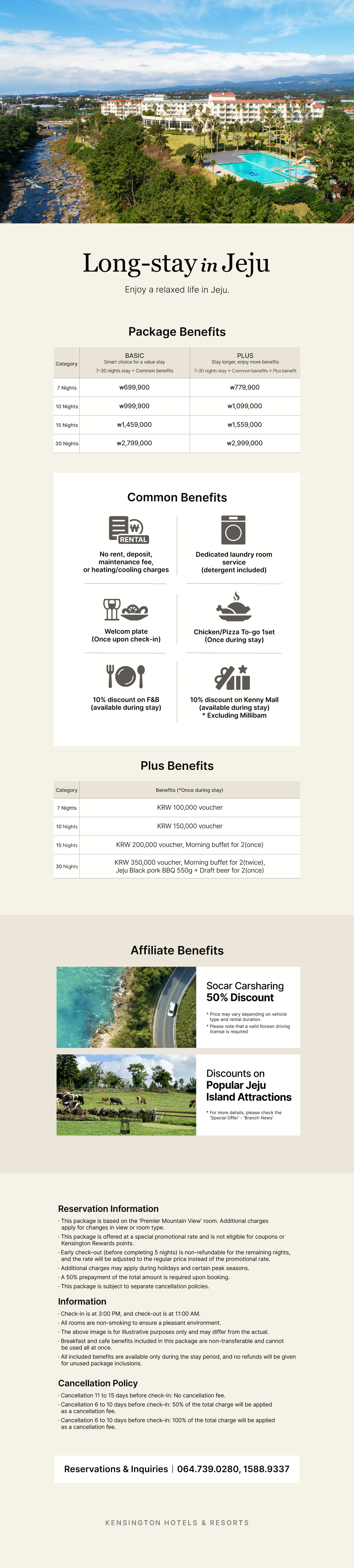 home 프로모션 객실 다이닝 연회 부대시설 액티비티 리조트소개 OVERVIEW 패키지 다이닝 & 이벤트 지점소식 지점소식 Kensington Resort Seogwipo - Long stay in jeju [7 Nights~30 Nights] 2025. 07. 29 The Longer You Stay, the More You Enjoy Exclusive offer for guests staying 7 nights or more. 목록