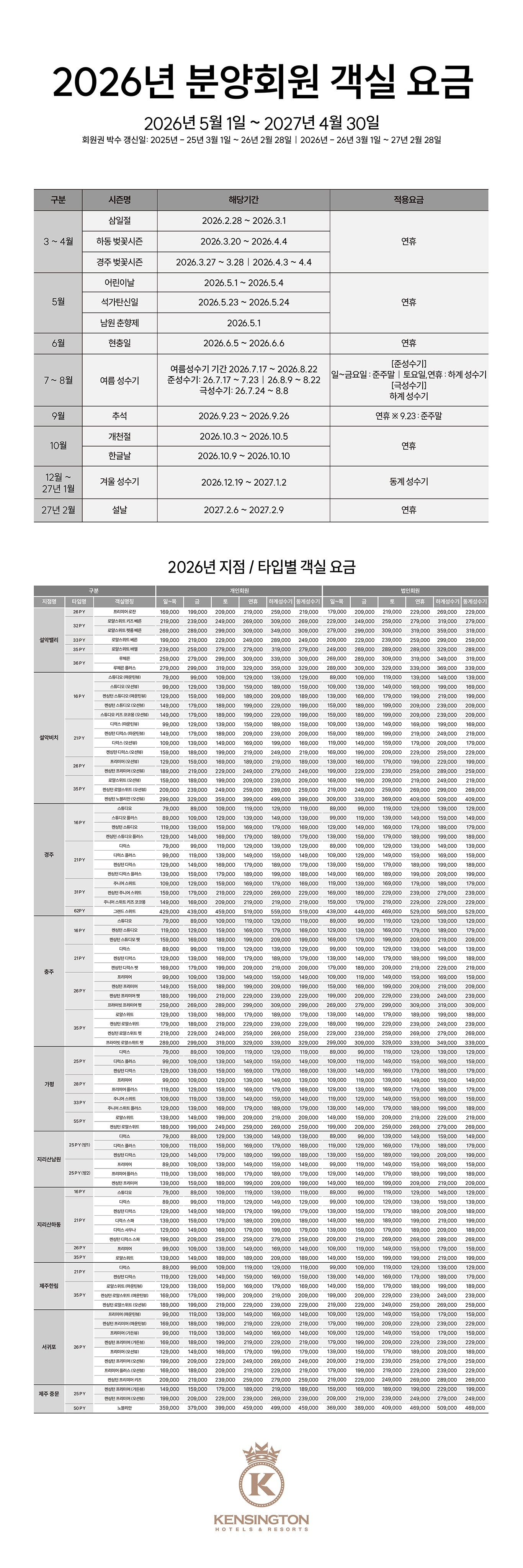 home 고객지원 공지사항 자주하는 질문 1:1문의 이용문의 자료실 당첨자 발표 고객지원 공지사항 자주하는 질문 1:1 문의 이용문의 자료실 당첨자 발표 [분양회원] 2026년 리조트 객실 요금 안내 전체 분양회원 2025. 12. 08 첨부파일 분양회원_객실요금표(26년).pdf 목록