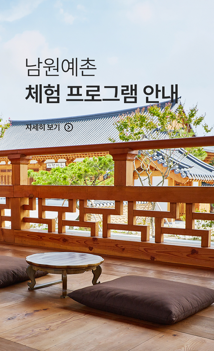 남원예촌 사랑의 도시 남원에서 즐기는 명품 한옥 체험 40평 로얄 스위트 남원예촌의 오직 하나뿐인 프라이빗 누마루 자세히 보기 명품 한조식 명품한옥에서 즐기는 정갈한 조식 한상 차림 한복 체험 머무는 모든 곳이 그림이 되는 한옥에서 즐기는 전통 한복 체험 자세히 보기 호텔명 남원예촌 체크인&체크아웃 닫기 객실수 1 성인 2 어린이 도움말보기 어린이는 만4세 이상 12세 이하입니다. 0 영아 도움말보기 영아는 0세 이상 24개월 미만입니다. 0 닫기 객실수 빼기 1 더하기 객실1 성인 빼기 2 더하기 어린이 빼기 0 더하기 영아 빼기 0 더하기 법인/프로모션 코드 입력 도움말보기 법인 코드 또는 프로모션 코드를 선택 후 코드를 입력해 주세요. 닫기 법인 코드 프로모션 코드 코드사용 소지하신 법인/프로모션 코드를 입력하여 객실을 검색하면법인/프로모션가로 객실 예약을 진행하실 수 있습니다. 예약찾기 PACKAGE 더보기 WELCOME 남원예촌 Welcome! 명품 한옥에서의 고즈넉한 여유를 즐겨보세요. 객실 1박 + 관광지 입장권 + 미니바 자세히 보기 FACILITIES 부용정 백제시대 고유 건축법으로 고즈넉한 멋을 더한 정자입니다. 다양한 전통 체험 프로그램을 접하고, 명품한옥의 가치를 느낄 수 있는 체험공간입니다. 자세히 보기 체험마루 고운색감과 곡선미가 녹아 있는 한복을 직접 입어 보며 추억을 만들어 보세요. 황이슬 한복 디자이너가 제안한 아름다운 한국의 멋, 한복을 느낄 수 있는 체험 공간입니다. 자세히 보기
