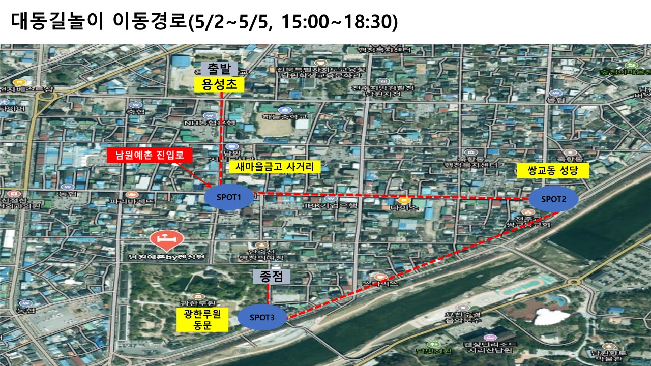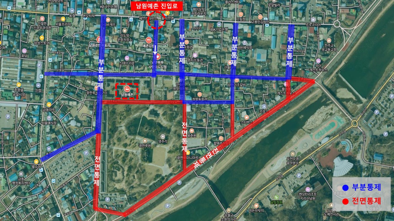 남원예촌 진입로인 새마을금고 사거리도 지나가기 때문에 해당 시간대 남원예촌 진입에 다소 혼잡함이 예상 됩니다.