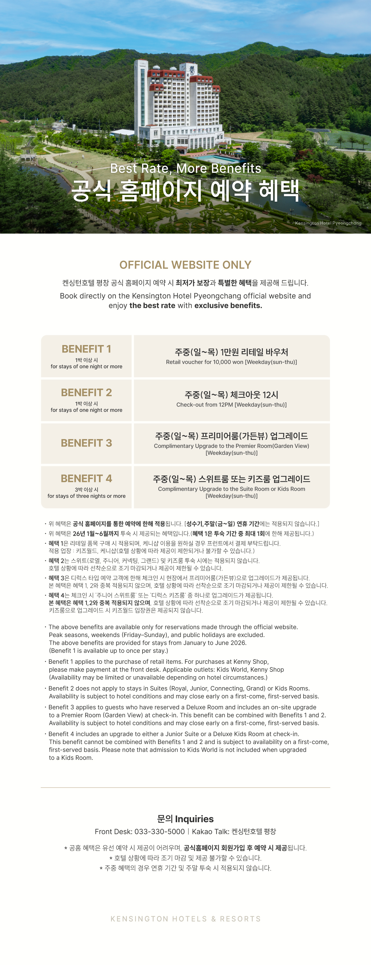 home 프로모션 객실 다이닝 웨딩&연회 부대시설 액티비티 호텔 소개 OVERVIEW 패키지 다이닝 & 이벤트 지점소식 지점소식 공식 홈페이지 혜택 2025. 12. 09 켄싱턴호텔 평창 공식 홈페이지 예약 시 특별한 혜택을 제공해드립니다. 목록