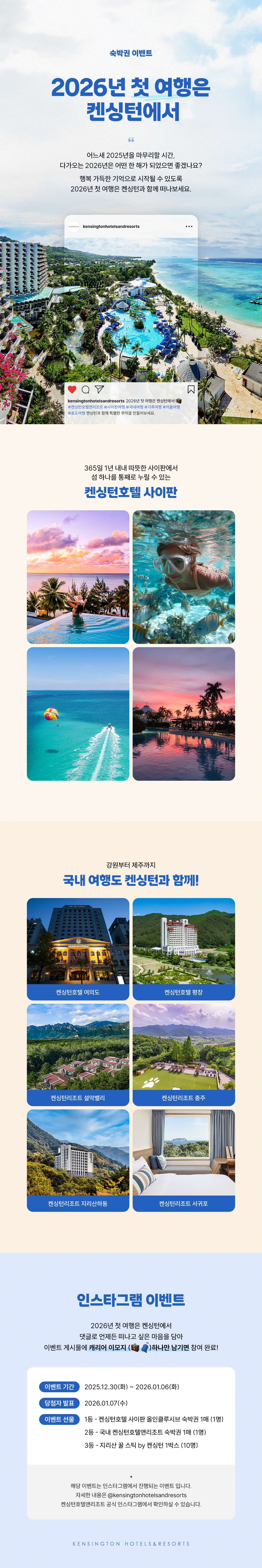 home 이벤트 이벤트 [인스타그램 팔로워 이벤트] 사이판부터 국내 여행까지! 공유하기 2026년 첫 여행은 켄싱턴과 함께! 사이판부터 국내 여행까지, 숙박권 이벤트 지금 참여하세요. 이벤트 기간 2025. 12. 30 ~ 2026. 01. 06 인스타그램 바로가기 진행중인 다른 이벤트 [Winter Journey] 켄싱턴 베어와 함께 떠나는 여행 리워즈 혜택 받고 떠나는 따뜻하고 안전한 사이판 여행 [개인회원전용] 회원예약보장 프로모션 [분양회원전용] 관광지 제휴 할인 누리자GO 목록 SNS 공유하기 블로그 카카오페이지 페이스북 URL 복사