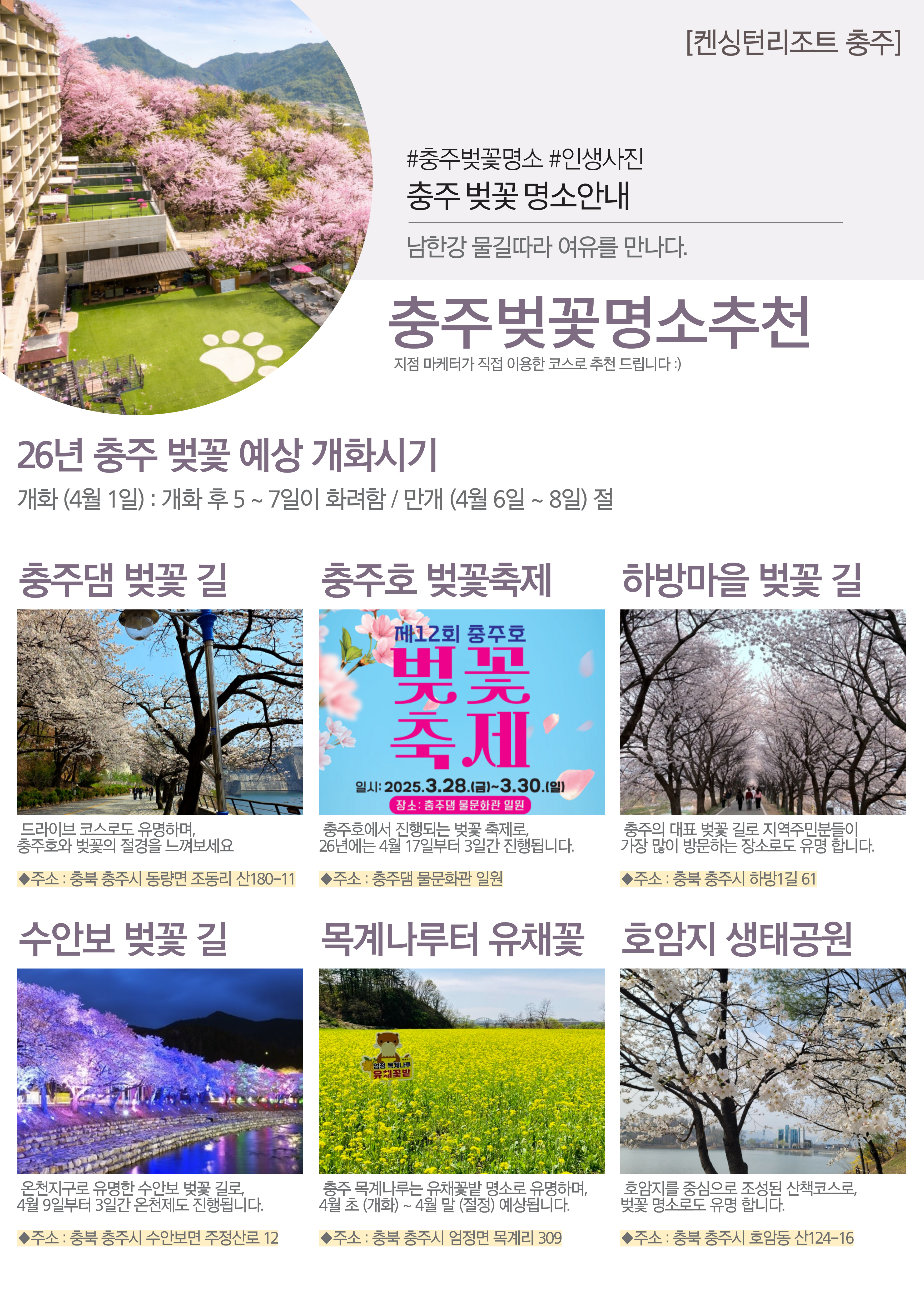 home 프로모션 객실 다이닝 연회 부대시설 액티비티 리조트소개 OVERVIEW 패키지 다이닝 & 이벤트 지점소식 지점소식 충주 [벚꽃명소] 추천 2026. 03. 10 충주 [벚꽃명소] 추천 목록