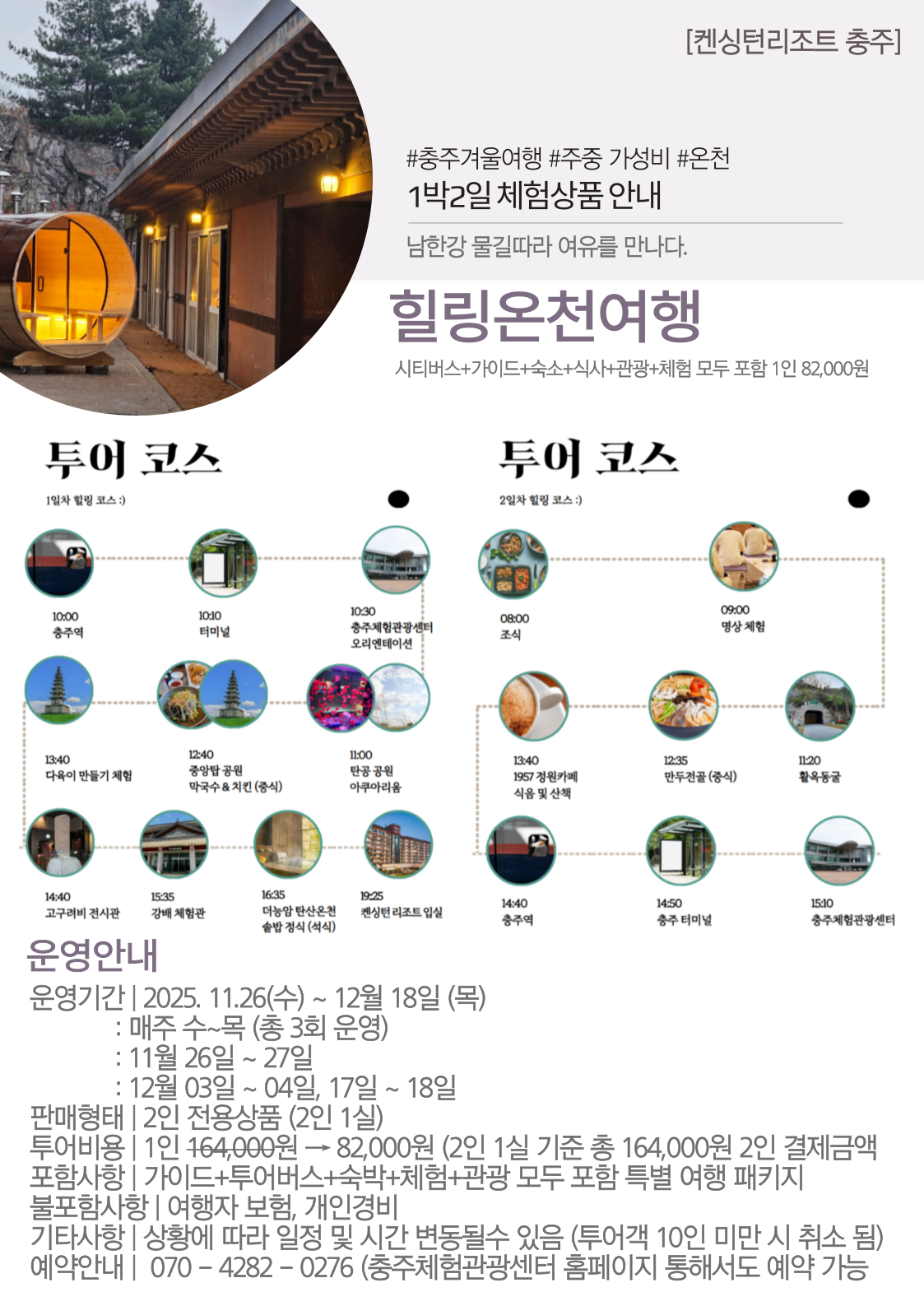 home 프로모션 객실 다이닝 연회 부대시설 액티비티 리조트소개 OVERVIEW 패키지 다이닝 & 이벤트 지점소식 지점소식 힐링온천여행 (1박 2일) [올인클루시브 상품 안내] 2025. 11. 30 충주시 문화관광 재단과의 MOU를 통해 주중 1인 82,000원에 (2인부터 예약가능) 투어버스+가이드+숙박+식사+체험+관광 모두 포함 된 가성비 상품이 나왔습니다 :) 목록