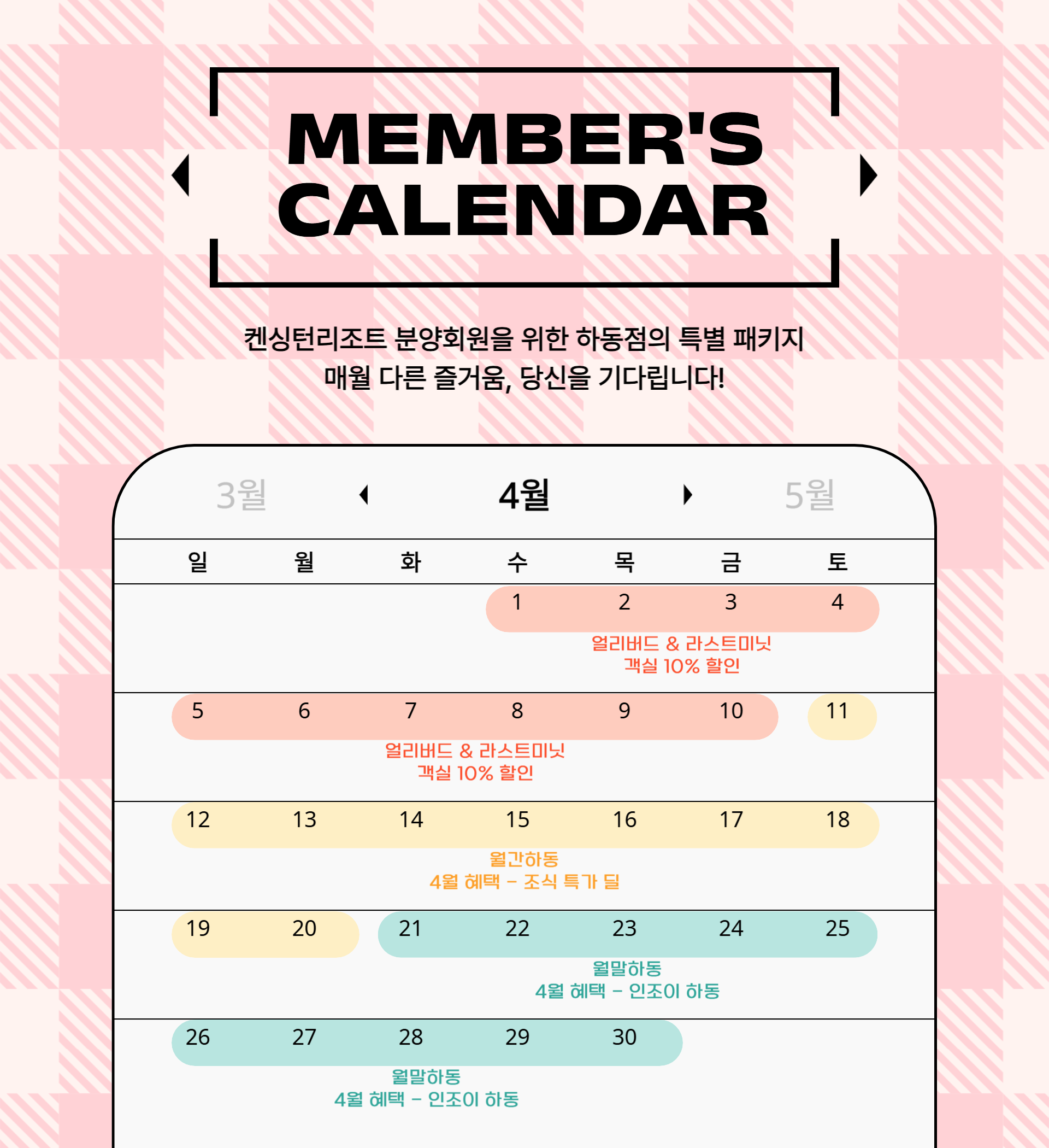 켄싱턴리조트 분양회원이라면 하동점에서 매월 달라지는 프로모션을 만나보세요!