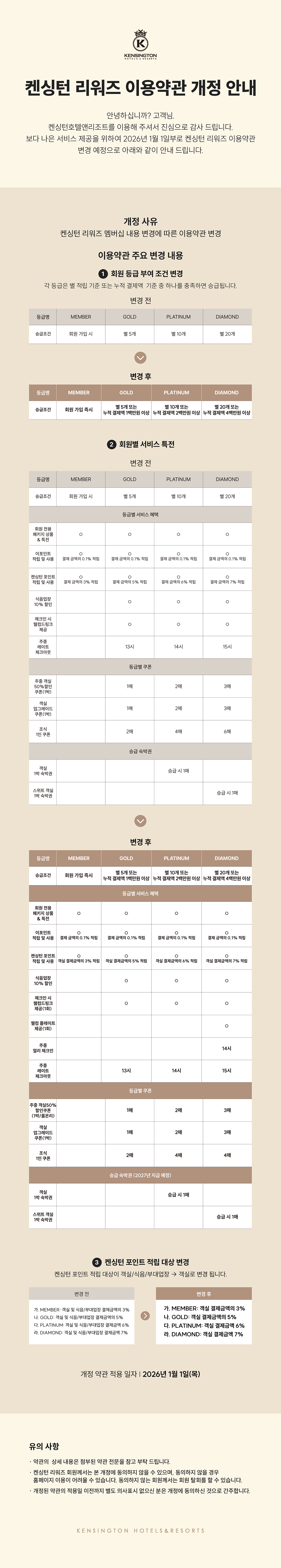 home 고객지원 공지사항 자주하는 질문 1:1문의 이용문의 자료실 당첨자 발표 고객지원 공지사항 자주하는 질문 1:1 문의 이용문의 자료실 당첨자 발표 2026 켄싱턴 리워즈 이용약관 개정 안내 전체 일반회원 2025. 11. 28 첨부파일 개정_전_약관_전문_켄싱턴_리워즈_이용약관.pdf 2026_개정_약관_전문_켄싱턴_리워즈_이용약관.pdf 목록