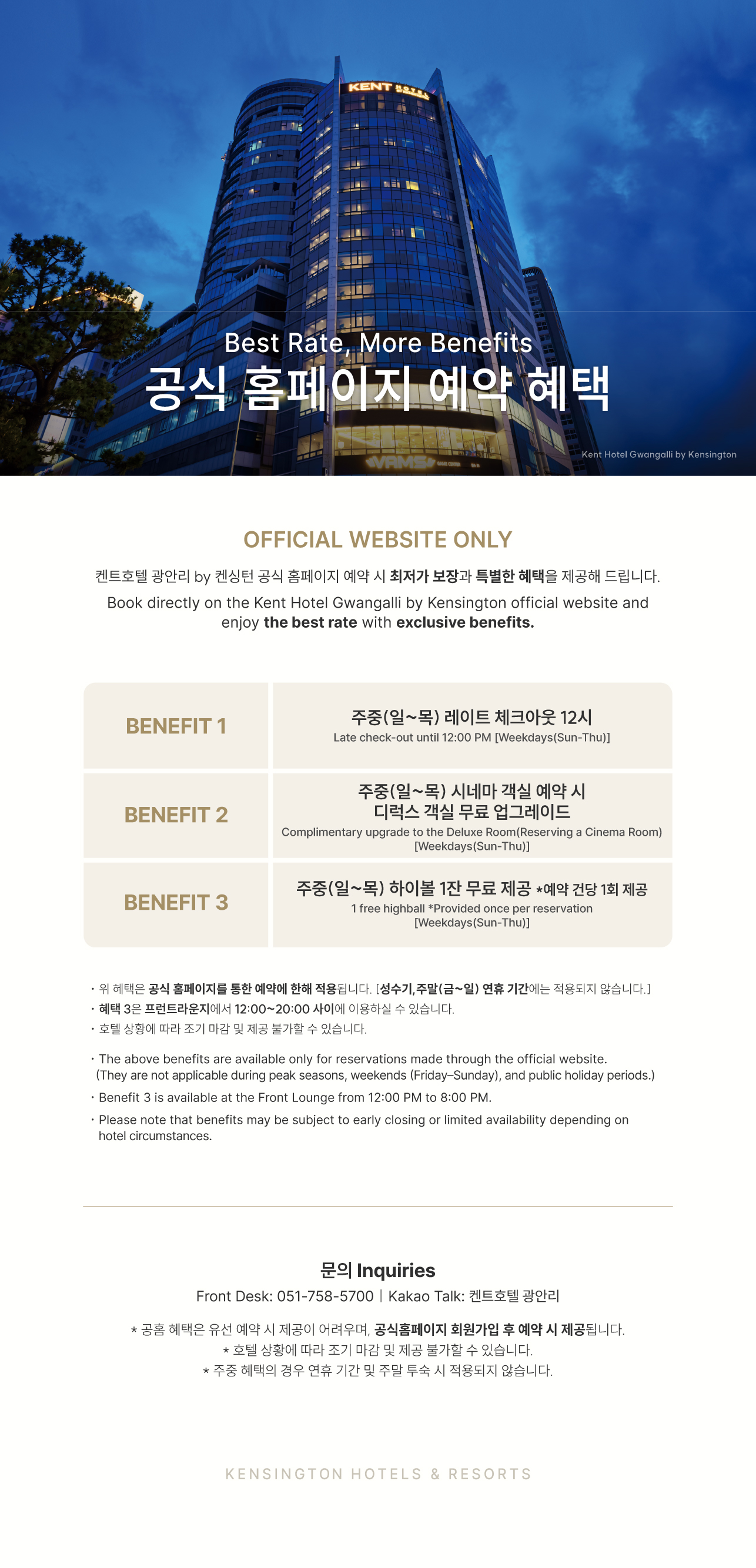 home 프로모션 객실 다이닝 웨딩&연회 부대시설 액티비티 호텔소개 OVERVIEW 패키지 다이닝 & 이벤트 지점소식 지점소식 공식 홈페이지 혜택 2026. 02. 26 켄트호텔 광안리 by 켄싱턴 공식 홈페이지 예약 시 특별한 혜택을 제공해드립니다. 바로가기 목록