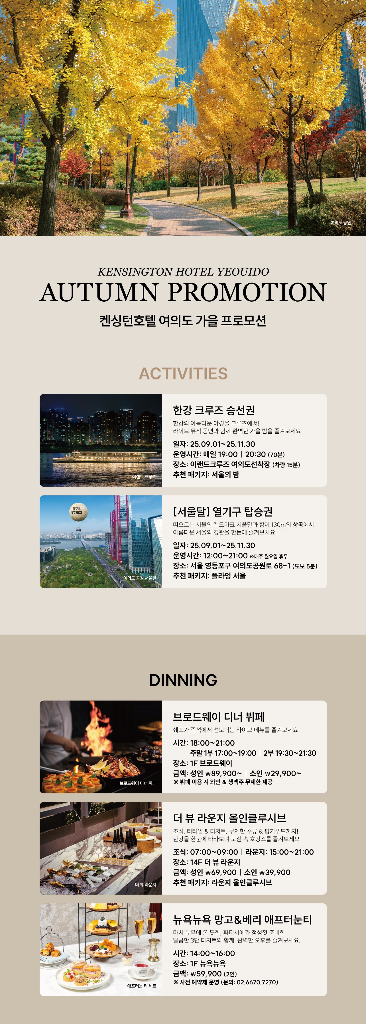 home 프로모션 객실 다이닝 웨딩&연회 부대시설 헤리티지 컬렉션 호텔소개 OVERVIEW 패키지 다이닝 & 이벤트 지점소식 지점소식 켄싱턴호텔 여의도 가을 프로모션 2025. 09. 16 가을 프로모션 패키지 및 이벤트 입니다. 목록