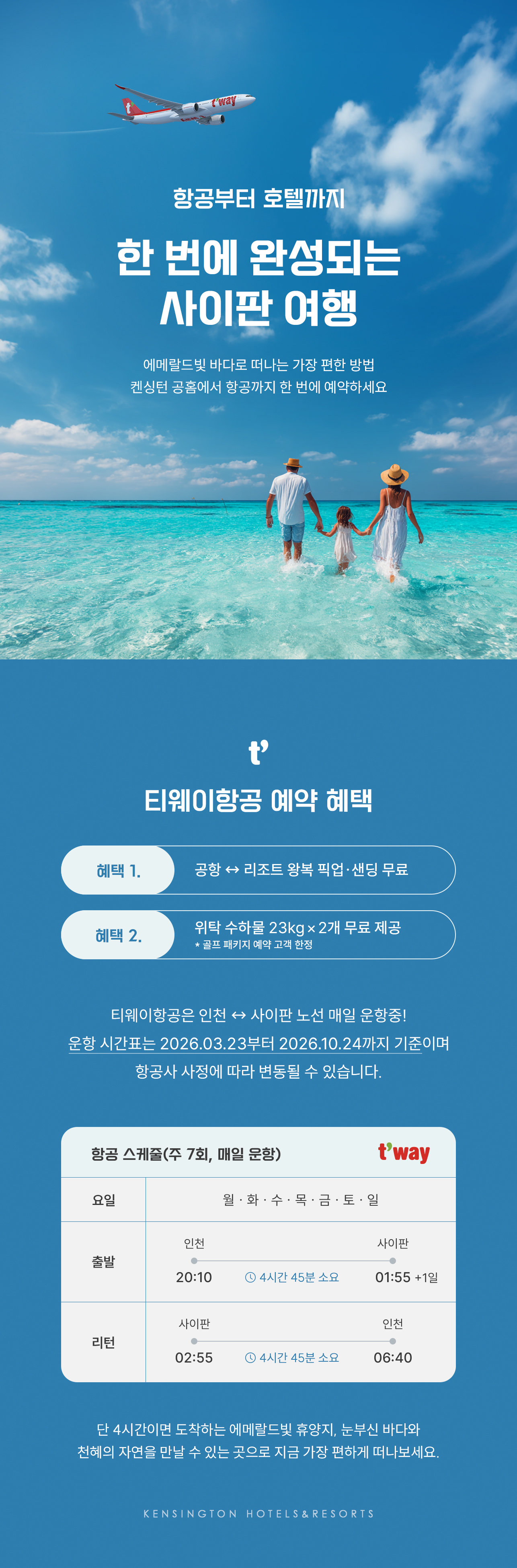 home 이벤트 이벤트 사이판 항공 프로모션 공유하기 한 번에 끝내는 간편한 사이판 여행! 항공권까지 켄싱턴 공식 홈페이지에서 예약하고 단독 혜택을 만나보세요. 이벤트 기간 2026. 03. 23 ~ 2026. 06. 30 사이판 항공권 예약 하기 진행중인 다른 이벤트 켄싱턴 유니버스 오픈 [개인회원전용] 회원예약보장 프로모션 [개인회원전용] 회원 대여 이벤트 목록 SNS 공유하기 블로그 카카오페이지 페이스북 URL 복사