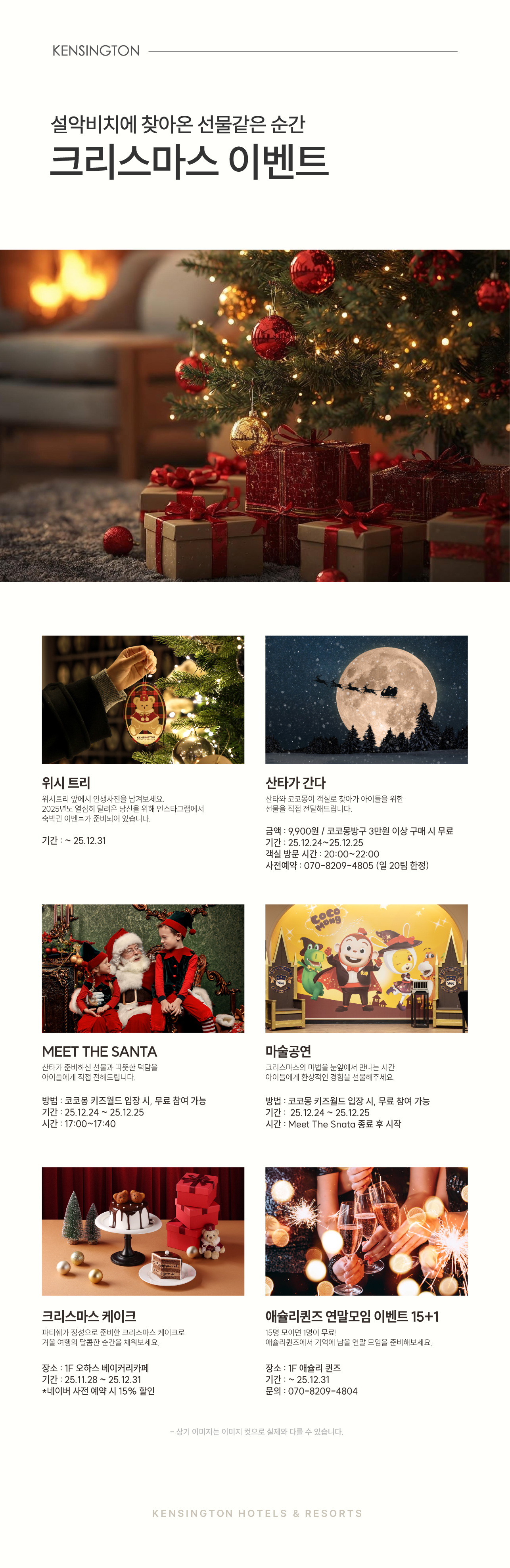 home 프로모션 객실 다이닝 웨딩&연회 부대시설 액티비티 리조트소개 OVERVIEW 패키지 다이닝 & 이벤트 지점소식 지점소식 2025 크리스마스 이벤트 2025. 12. 09 설악비치에 찾아온 선물같은 순간! 목록