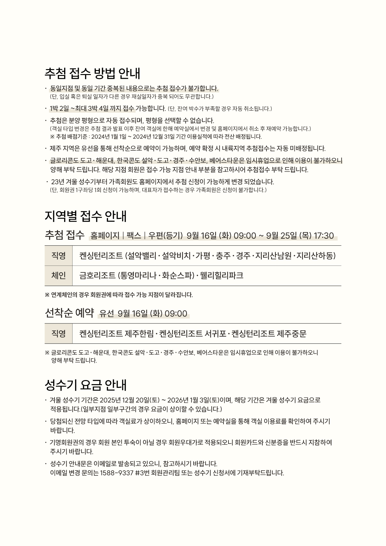 home 고객지원 공지사항 자주하는 질문 1:1문의 이용문의 자료실 당첨자 발표 고객지원 공지사항 자주하는 질문 1:1 문의 이용문의 자료실 당첨자 발표 [분양회원] 2025년 켄싱턴리조트 겨울성수기 안내 리조트 전체 분양회원 2025. 09. 05 첨부파일 켄싱턴리조트_겨울_성수기_신청서.pdf 켄싱턴리조트_겨울_성수기_안내문.pdf 목록