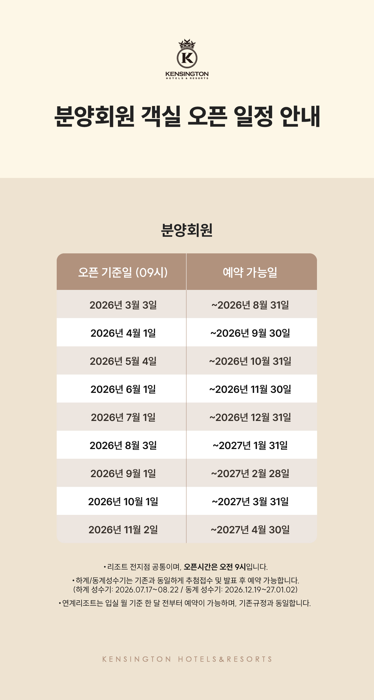 home 고객지원 공지사항 자주하는 질문 1:1문의 이용문의 자료실 당첨자 발표 고객지원 공지사항 자주하는 질문 1:1 문의 이용문의 자료실 당첨자 발표 [분양회원] 2026년 객실 오픈 일정 안내 리조트 전체 분양회원 2026. 03. 04 목록