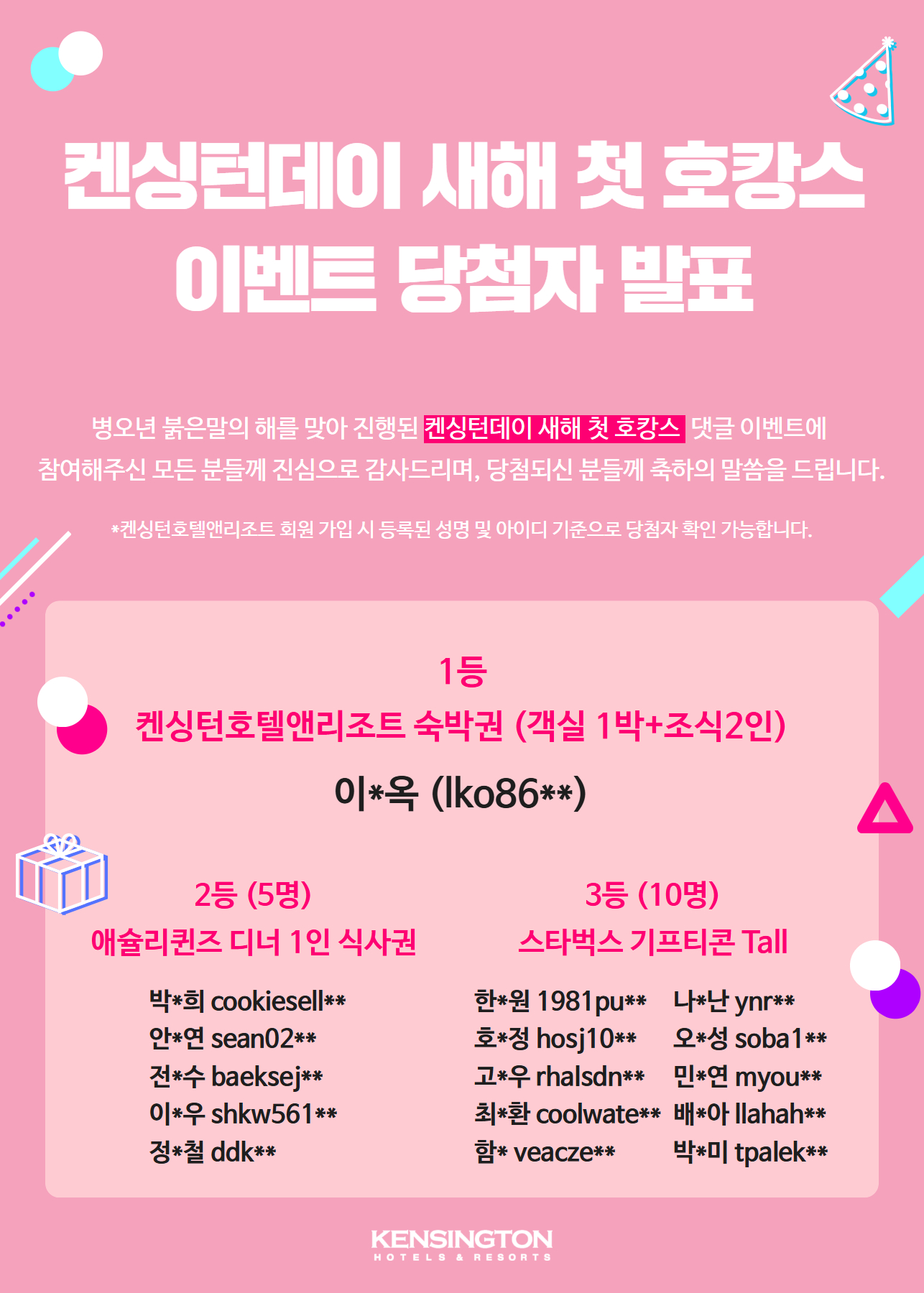 공유하기켄싱턴데이 새해 첫 호캉스 댓글 이벤트에 참여해 주신 모든 분들께 감사드리며 당첨되신 분들 진심으로 축하드립니다!