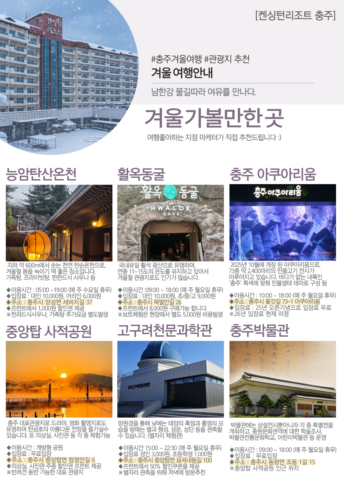 home 프로모션 객실 다이닝 연회 부대시설 액티비티 리조트소개 OVERVIEW 패키지 다이닝 & 이벤트 지점소식 지점소식 충주 마케터가 추천하는 [충주 겨울 가볼만한곳] 2025. 11. 24 충주 마케터가 추천하는 [충주 겨울 가볼만한곳] 목록