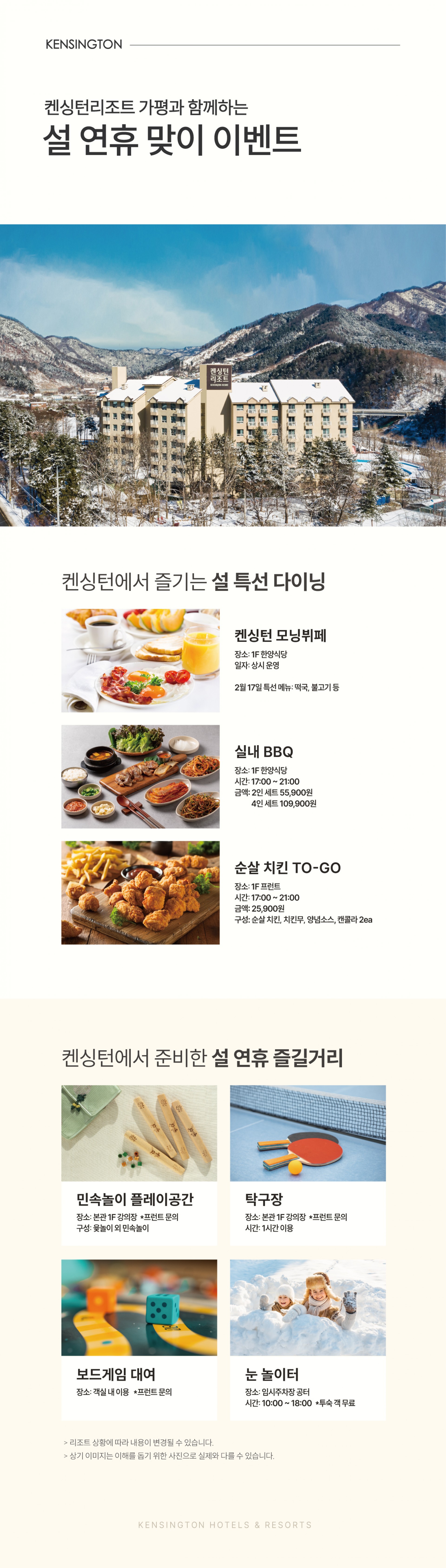 home 프로모션 객실 다이닝 웨딩&연회 부대시설 액티비티 리조트소개 설 연휴 이벤트 아침고요수목원 오색별빛정원전 피노키오&어린왕자 별빛축제 남이섬(나미나라공화국) 아침고요수목원 아침고요동물원 가평 레일바이크 페리 크루즈 보드게임 대여 서비스 설 연휴 이벤트 설 연휴 이벤트 켄싱턴리조트 가평점에서 다양한 이벤트와 함께 추억을 만들어보세요. 상세정보 기간 2026. 02. 09 ~ 2026. 02. 17 (매일) 이용 장소켄싱턴리조트 가평 예약 및 문의031-584-9380 (내선 1001) 대상투숙객 모두 이용안내 2026년 설 연휴 이벤트를 즐겨보세요.
