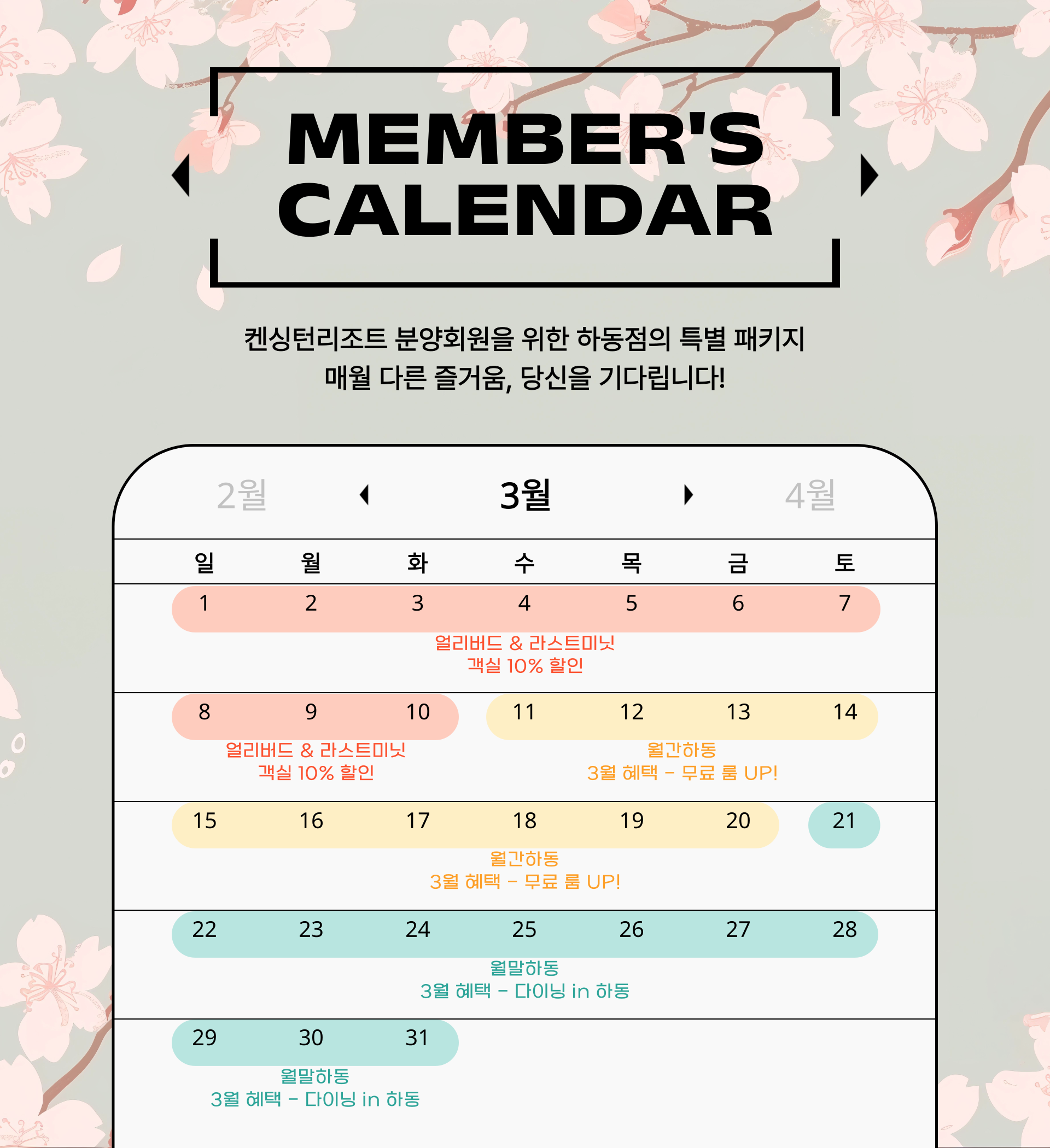 켄싱턴리조트 분양회원이라면 하동점에서 매월 달라지는 프로모션을 만나보세요!