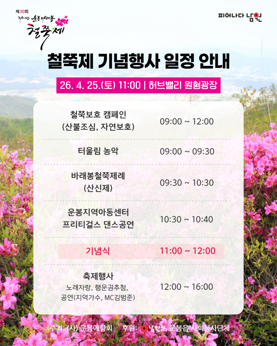 home 프로모션 객실 다이닝 웨딩&연회 부대시설 액티비티 리조트소개 OVERVIEW 패키지 다이닝 & 이벤트 지점소식 다이닝 & 이벤트 제30회 지리산 운봉 바래봉 철쭉제 적용기간2026. 04. 25 ~ 2026. 05. 25 공유하기 우리나라 최대의 철쭉 군락지인 바래봉 일대를 분홍빛으로 물들인 철쭉을 감상해보세요 이용문의 적용기간 2026. 04. 25 ~ 2026. 05. 25 이용 금액 현장 문의 이용 장소 지리산 허브밸리 원형광장 예약 및 문의 남원시청 관광시설과 (☎ 063-620-8924) 갤러리 목록 SNS 공유하기 블로그 카카오페이지 페이스북 URL 복사